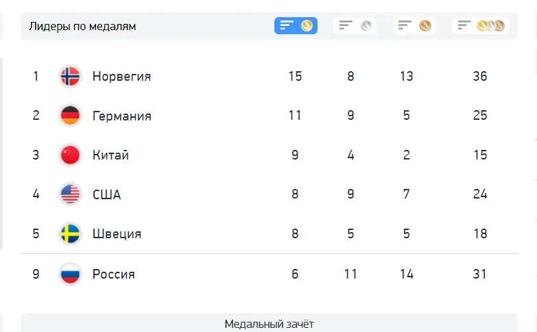 Tốp huy chương Olympic mùa đông Bắc Kinh tính đến sáng 20-2 với lần lượt các vị trí từ 1- Na Uy, 2- Đức ,3- Trung Quốc, 4-Mỹ, 5- Thụy Điển....và Nga (thứ chín).