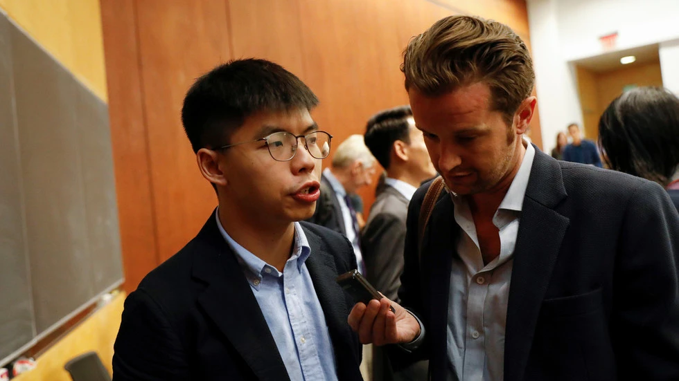 Thủ lĩnh biểu tình ở Hong Kong Hoàng Chi Phong trả lời truyền thông khi ở Mỹ tuần trước. Ảnh: REUTERS