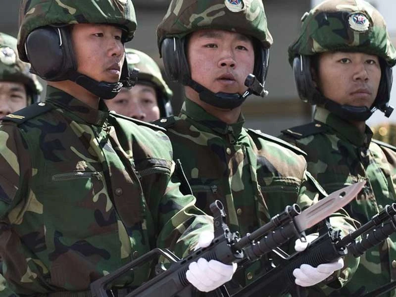 Các binh lính Trung Quốc thuộc Sư đoàn Thiết giáp số sáu, được trang bị súng bán tự động, tại doanh trại đóng ở ngoại ô thủ đô Bắc Kinh. Ảnh: AP