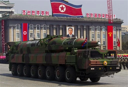 Xe chở tên lửa Triều Tiên tại một cuộc diễu hành quân sự ở Bình Nhưỡng (Triều Tiên). Ảnh: AP
