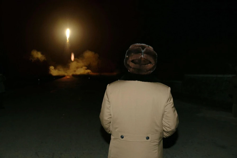 Nhà lãnh đạo Triều Tiên Kim Jong Un theo dõi một vụ phóng tên lửa đạn đạo ở một nơi bí mật. Ảnh: EPA