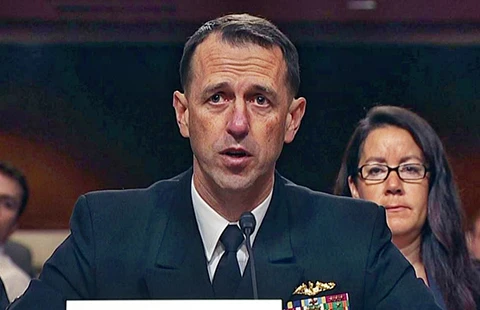 Đô đốc John Richardson điều trần trước Ủy ban Quân lực Thượng viện Mỹ ngày 30-7. Ảnh: HẢI QUÂN MỸ