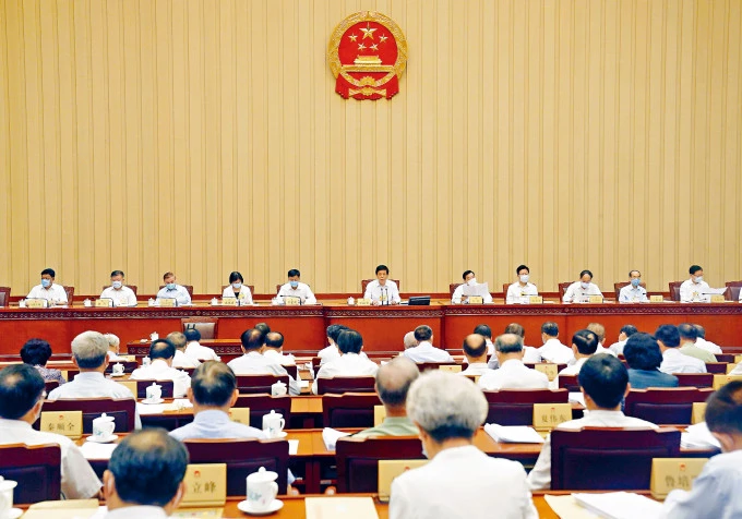 Buổi họp ngày 29-6 của Ủy ban Thường vụ Quốc hội Trung Quốc thảo luận dự thảo luật an ninh quốc gia cho Hong Kong. Ảnh: TÂN HOA XÃ