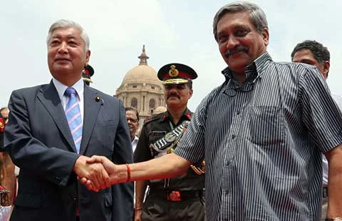 Bộ trưởng Quốc phòng Ấn Độ Manohar Parrikar (phải) đón người đồng cấp Nhật Gen Nakatani tại trụ sở Bộ Quốc phòng ở New Delhi ngày 14-7. Ảnh: AP