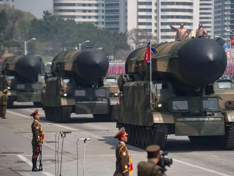 Triều Tiên trình diễn các tên lửa trong cuộc diễu binh ở quảng trường Kim Nhật Thành hôm 15-4. Ảnh: AFP