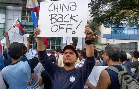 Biểu tình phản đối TQ trước lãnh sự quán TQ tại TP Makati ngày 12-6. Biểu ngữ ghi dòng chữ “China back off!” (TQ cút đi!). Ảnh: INQUIRER