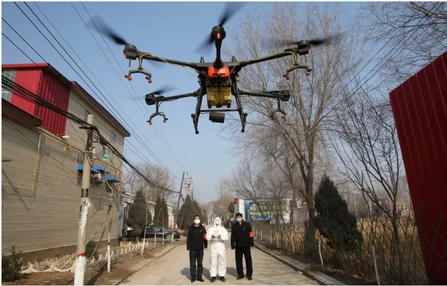 Trung Quốc dùng máy bay không người lái phun thuốc khử trùng tại tỉnh Hà Bắc. Ảnh: REUTERS