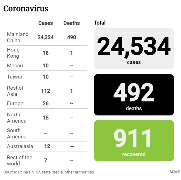 Số người tử vong do dịch Corona tính đến ngày 5-2 đã ở mức cao kỷ lục với 65 trường hợp tử vong mới tại Trung Quốc, nâng tổng số người chết do dịch bệnh này lên đến 492 người.