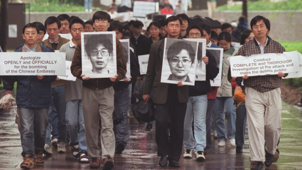 Người Trung Quốc biểu tình phản đối vụ đánh bom đại sứ quán Trung Quốc ở Belgrade, Nam Tư. Ảnh: RT