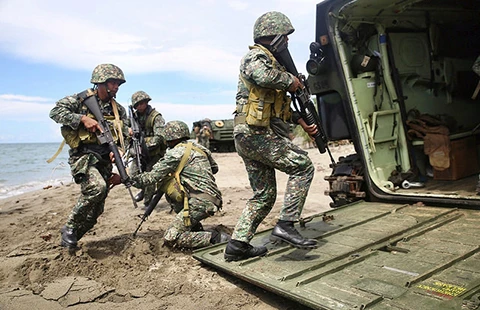 Các binh sĩ Mỹ và Philippines tập đổ bộ ở Palawan (Philippines) ngày 7-6 trong khuôn khổ cuộc tập trận chung CARAT kéo dài năm ngày từ ngày 6-6. Ảnh: HẢI QUÂN MỸ