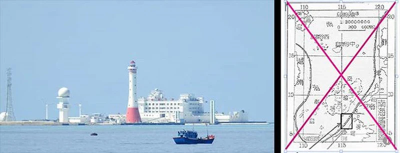 Hạ tầng TQ xây trái phép ở Gạc Ma và bản đồ phi pháp năm 1951. Ảnh: THANH NIÊN