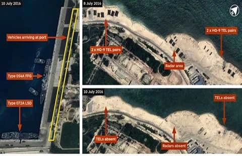 Ảnh cho thấy dàn tên lửa chiến lược đất đối không HQ-9 đã được rút khỏi vị trí triển khai dọc bờ biển phía bắc đảo Phú Lâm hồi tháng 2-2016.