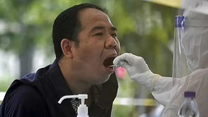 Một người dân Bắc Kinh đang được lấy mẫu để xét nghiệm COVID-19. Ảnh: AFP