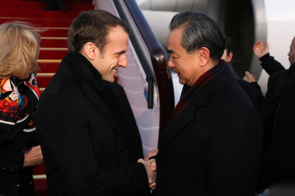 Tổng thống Pháp Emmanuel Macron (trái) tiếp đón Bộ trưởng Ngoại giao Trung Quốc Vương Nghị (phải) khi ông đặt chân đến thủ đô Paris ngày 29-8. Ảnh: REUTERS