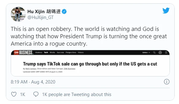 Ông Hồ Tích Tiến - tổng biên tập tờ Thời báo Hoàn Cầu của Trung Quốc cũng gọi hành động của Microsoft và Mỹ là “một vụ cướp công khai” và cho rằng “Tổng thống Trump đang biến nước Mỹ vĩ đại một thời thành một quốc gia bất hảo”.