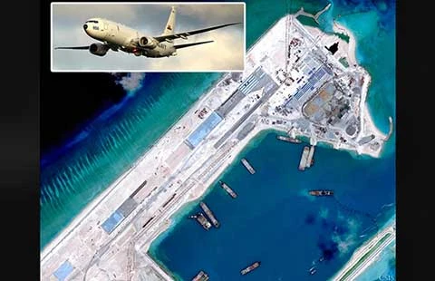 Máy bay tuần tra biển P8-A Poseidon của Mỹ phát hiện Trung Quốc bồi đắp trái phép trên Đá Chữ Thập. Ảnh: PHILSTAR