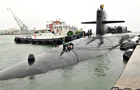 Tàu ngầm hạt nhân Mỹ USS Ohio đến Philippines ngày 22-3, tức một tuần sau khi tàu hải cảnh Trung Quốc đâm tàu cá Philippines ở bãi cạn Scarborough. Ảnh: BỘ QUỐC PHÒNG MỸ