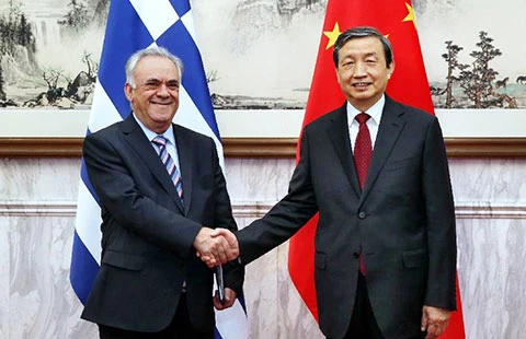 Phó Thủ tướng Hy Lạp Yiannis Dragasakis (trái) và Phó Thủ tướng TQ Mã Khải hôm 27-3 tại Bắc Kinh. Ảnh: THX