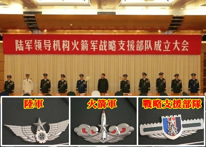 Lễ thành lập và huy hiệu của ba đơn vị mới thành lập (từ trái qua là Lục quân, Tên lửa và Chi viện chiến lược). Ảnh: Tân Hoa xã