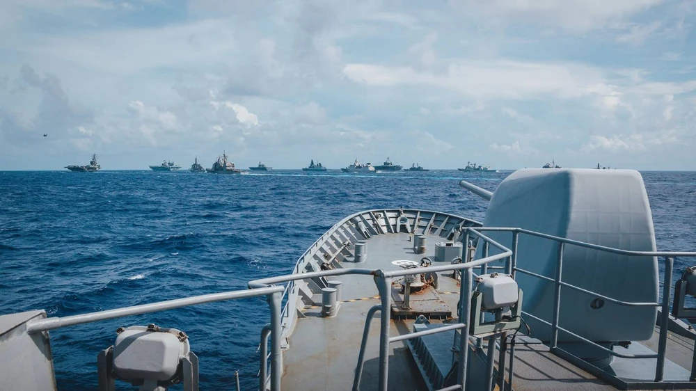 Tàu HMNZS Te Kaha của New Zealand tập trận cùng các tàu của hải quân đối tác trên biển Philippines. Ảnh: NZDF / STUFF