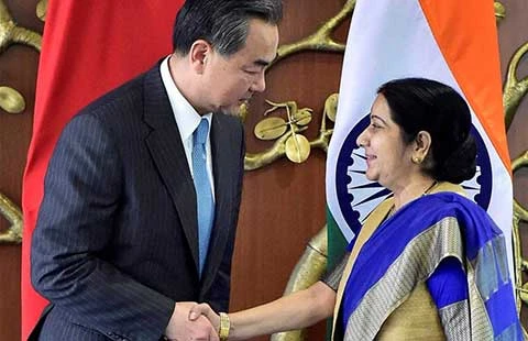Bộ trưởng Ngoại giao Ấn Độ Sushma Swaraj tiếp người đồng cấp Vương Nghị tại New Delhi ngày 13-8. Ảnh: PTI
