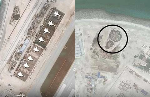 Trong khi vẫn chưa có hình ảnh nào cho thấy TQ đã bắt đầu kế hoạch cải tạo bãi cạn Scarborough, tổ chức Sáng kiến Minh bạch hàng hải châu Á (AMTI) trực thuộc Trung tâm Nghiên cứu chiến lược và quốc tế (CSIS) ở Washington đã công bố báo cáo ghi nhận hình ảnh qua vệ tinh cho thấy TQ đã xây dựng các nhà để máy bay bọc thép trên đá Chữ Thập, đá Subi và đá Vành Khăn thuộc quần đảo Trường Sa của Việt Nam.