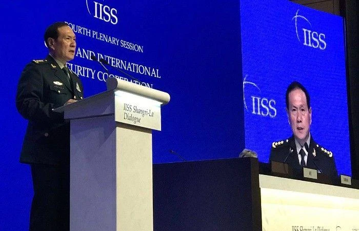 Bộ trưởng Bộ Quốc phòng Trung Quốc Ngụy Phương Hòa phát biểu hôm 1-6 tại Đối thoại Shangri-la 2019. Ảnh: IISS
