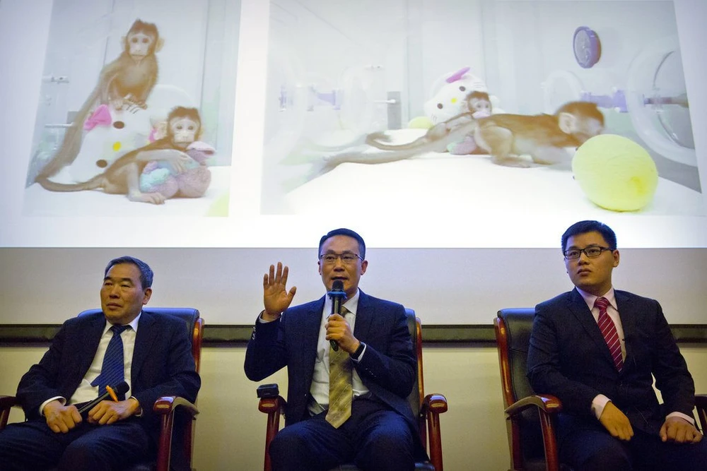 Ông Sun Qiang (giữa), Giám đốc cơ sở nghiên cứu linh trưởng tại Viện hàn lâm Khoa học Trung Quốc trong cuộc họp báo ở Bắc Kinh ngày 24-1.Ảnh: SCMP