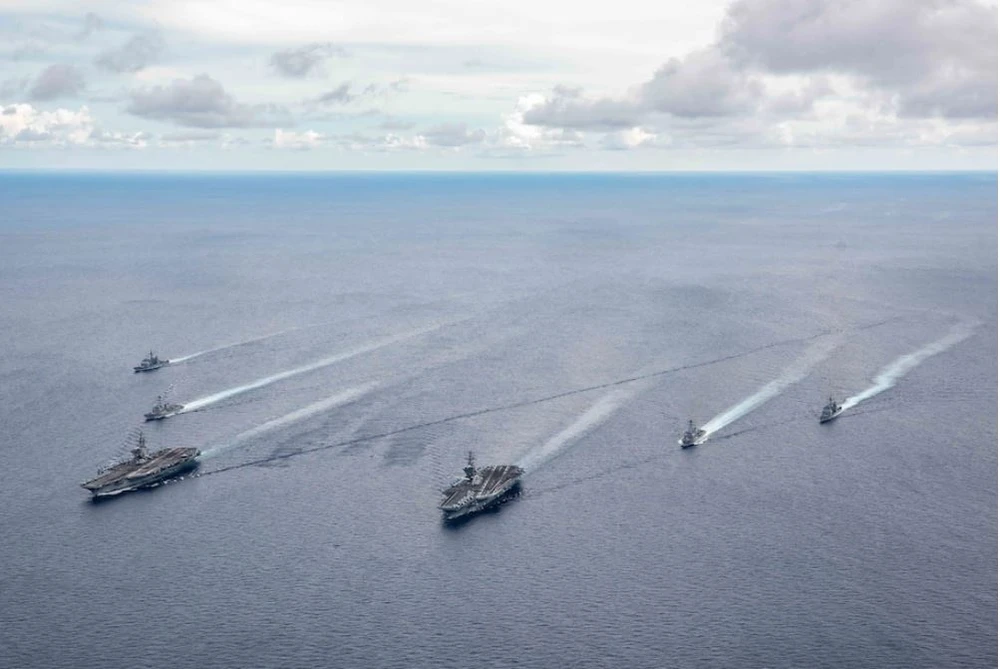 Hai nhóm tác chiến tàu sân bay USS Nimitz và USS Ronald Reagan của Hải quân Mỹ tập trận ở Biển Đông ngày 6-7. Ảnh: Jason Tarleton/U.S. NAVY/EPA-EFE/SHUTTERSTOCK