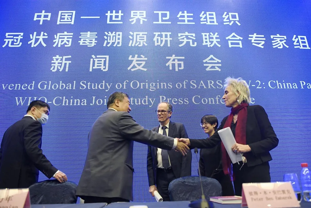 Các chuyên gia Trung Quốc và Tổ chức Y tế Thế giới bắt tay nhau sau một cuộc họp báo ở TP Vũ Hán hồi tháng 2-2021. Ảnh: CGTN
