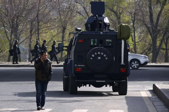 Xe quân sự chạy trên đường , trước nhà ga Urumqi ở Tân Cương. Ảnh: Reuters