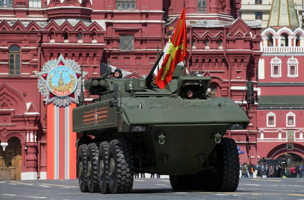 Xe bọc thép chở quân Bumerang trong lễ duyệt binh mừng Ngày Chiến thắng tại Quảng trường Đỏ, thủ đô Moscow, Nga hôm 9-5 (Nguồn: Sputnik News)