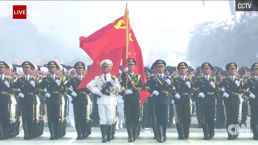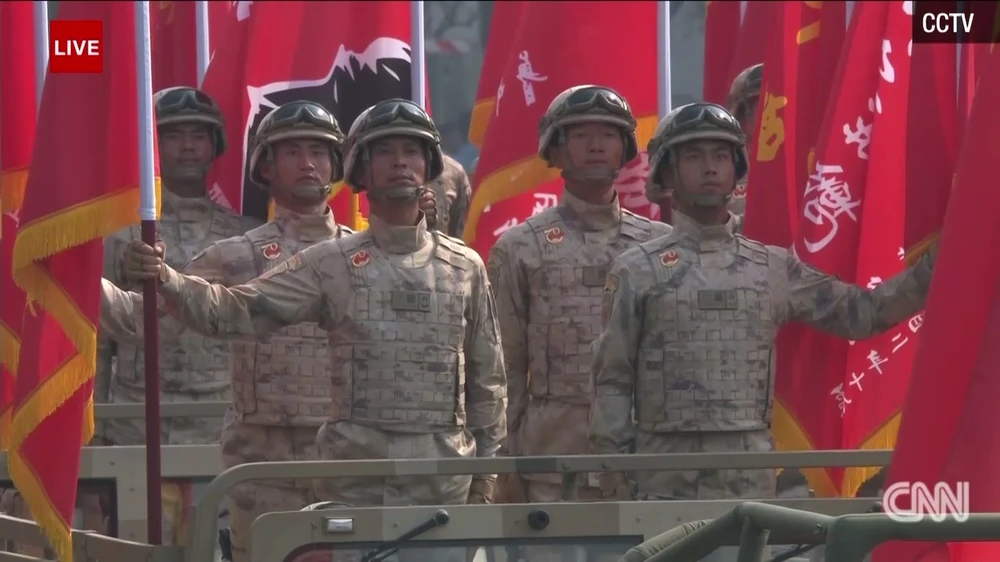 Một nhóm binh lính Trung Quốc mang cờ tiến vào lễ duyệt binh. Ảnh: CNN