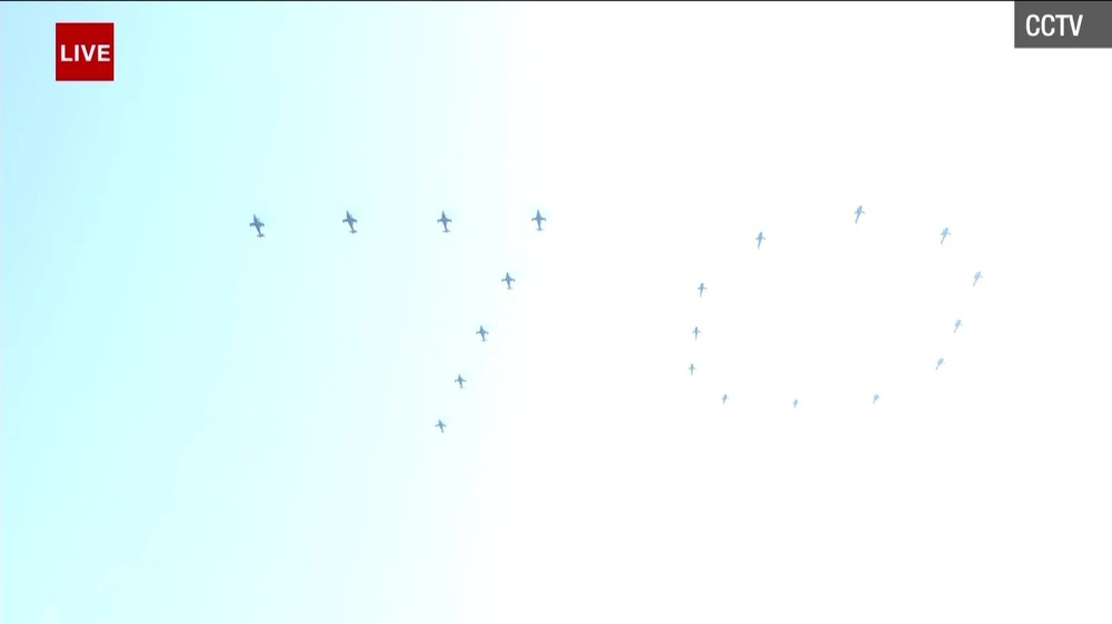Nhiều máy bay bay theo đội hình để tạo ra một con số "70" trên bầu trời - để đánh dấu lễ kỷ niệm 70 năm nước Cộng hòa Nhân dân Trung Hoa. Ảnh: CNN