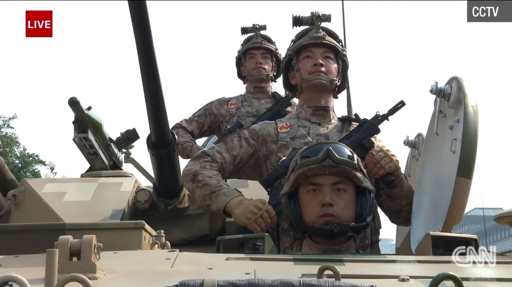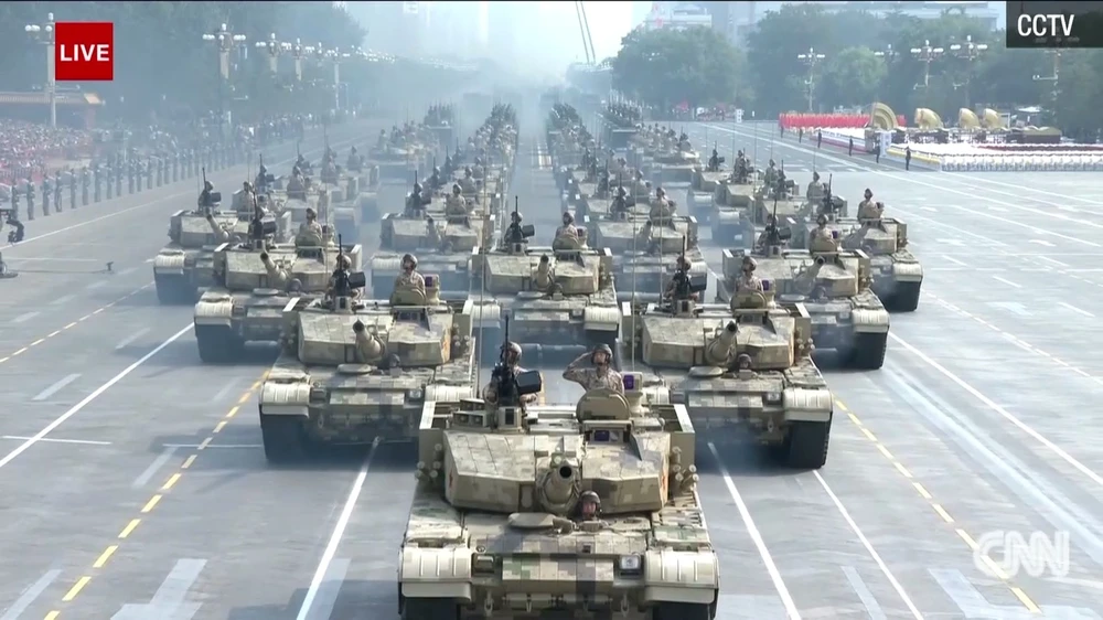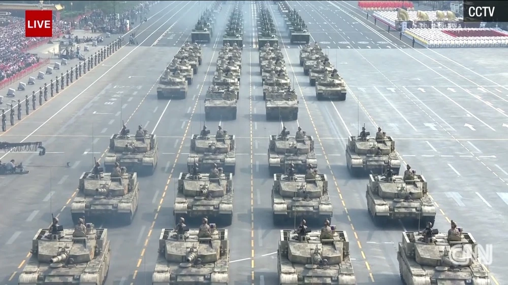 Một số lượng lớn xe tăng đang diễu hành xuống quảng trường Thiên An Môn. Hôm nay dự kiến còn có sự ra mắt của một số khí tài quân sự mới chưa từng được Trung Quốc công bố từ trước đến nay. Ảnh: CNN