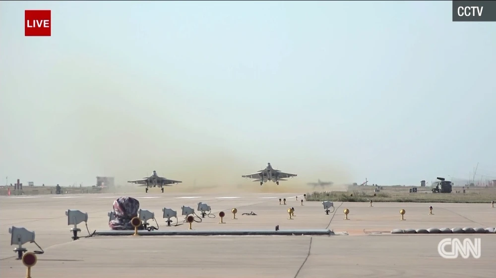 Nhiều máy bay quân sự bắt đầu cất cánh chuẩn bị cho màn trình diễn khí tài quân sự trên không. Ảnh: CNN
