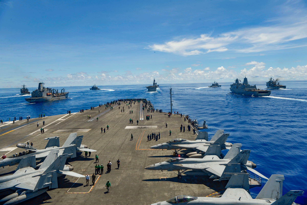 Nhóm tác chiến tàu sân bay USS Ronald Reagan trong cuộc tập trận chung với hải quân Úc, Nhật trên Biển Đông hồi tháng 10. Ảnh: AP