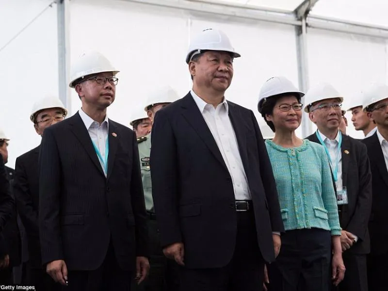 Chủ tịch Trung Quốc Tập Cận Bình(giữa) và Trưởng đặc khu hành chính Hong Kong Carrie Lam đến thị sát tiến độ thi công cây cầu. Ảnh: GETTY