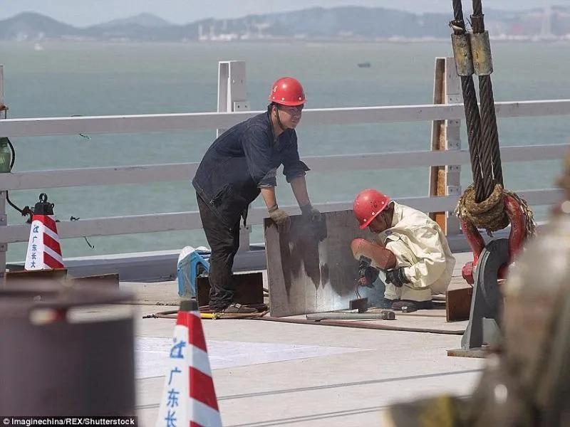 Yin Haiqing, kỹ sư chính của dự án, cho biết đội ngũ xây dựng đã tốn tới 96 giờ đồng hồ để đưa ống cầu đầu tiên xuống biển. Nhiều công nhân và kỹ sư đã phải thức bốn ngày liên tiếp để thực hiện nhiệm vụ trong những ngày đầu tiên. Ảnh: GETTY