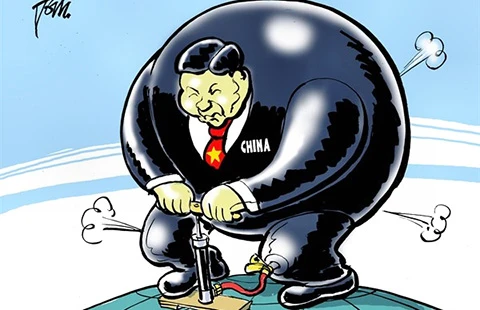 Trung Quốc tổ chức duyệt binh vào lúc bong bóng bất động sản của Trung Quốc phình to. Biếm họa của TOM JANSSEN (báo The Netherlands của Hà Lan)