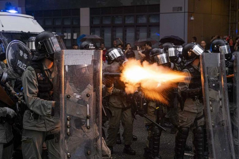 Một sĩ quan cảnh sát trong trang bị chống bạo loạn bắn hơi cay vào người biểu tình trong cuộc đụng độ ở quận Tsuen Wan của Hong Kong vào ngày 25-8-2019. Ảnh: The New York Times