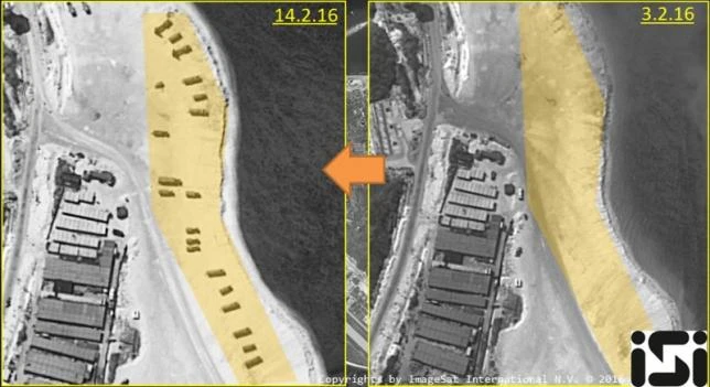 Hình ảnh vệ tinh chụp đảo Phú Lâm trong ngày 3-2 (phải) và ngày 14-2. Ảnh: REUTERS