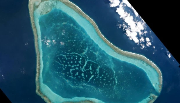 Bãi cạn Scarborough ở biển Đông. Hình ảnh được chụp bởi Planet Labs bào ngày 12-3 ( Ảnh: Reuter)