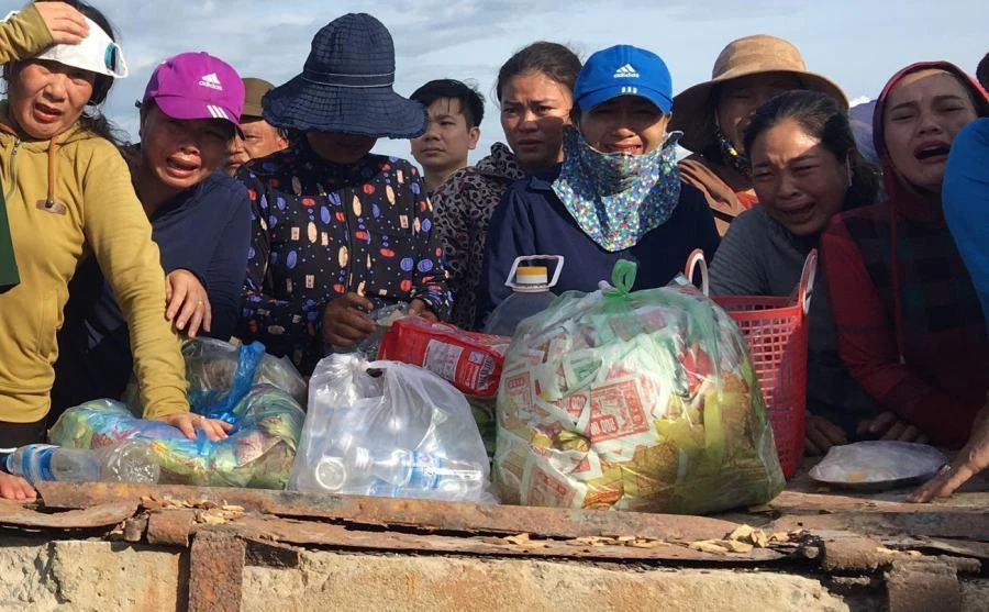 Những người vợ, người mẹ đứng khóc chờ thông tin các ngư dân bị nạn.