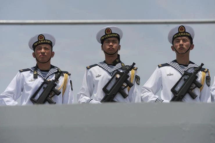 Binh sĩ Trung Quốc đứng trên boong tàu của Hải quân thuộc Quân giải phóng quân Nhân dân Trung Quốc (PLA). Ảnh: AFP