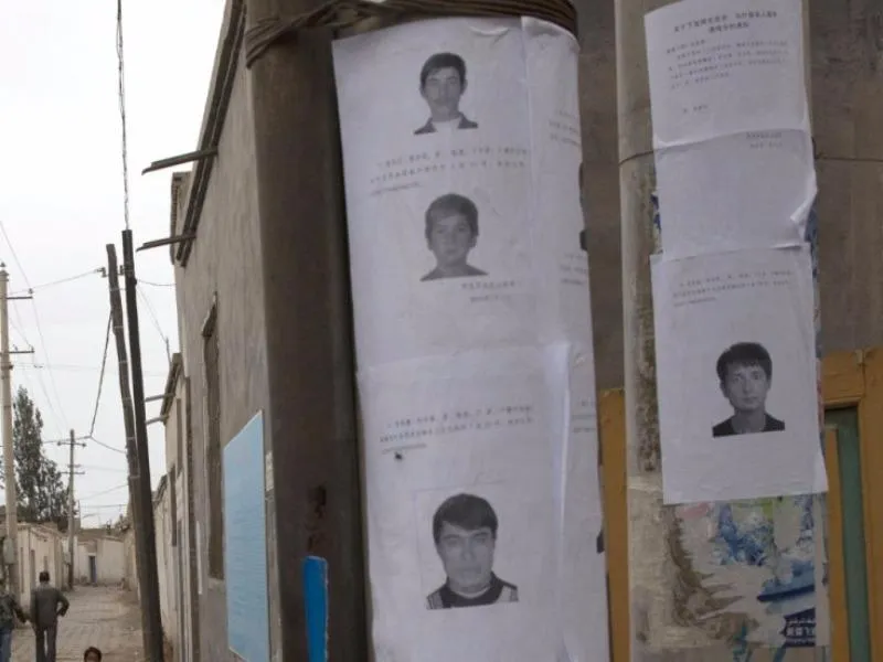 Các tờ giấy đăng lệnh truy nã những đối tượng liên quan trong các vụ tấn công khủng bố được dán ở Tân Cương hồi năm 2014. Ảnh: AP