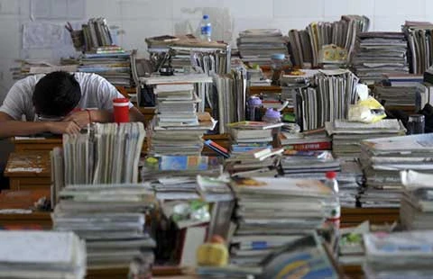 Một học sinh TQ đang gục bên “núi” bài vở ôn thi Gaokao - kỳ thi đại học của TQ. Ảnh: REUTERS