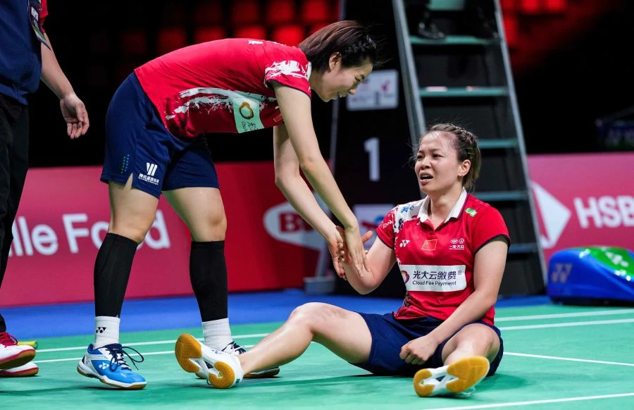 Bộ đôi Trung Quốc, Chen Qing Chen - Jia Yi Fan thất thần sau khi giành chiến thắng quân bình tỉ số 1-1 trước đội tuyển Nhật Bản. ẢNH: AFP