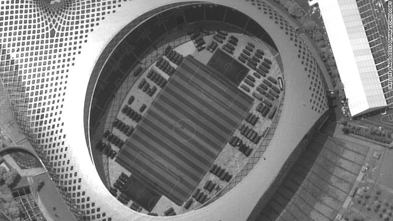 Ảnh vệ tinh cho thấy các phương tiện quân sự của Trung Quốc tập trung tại một sân vận động ở Thâm Quyến, gần ranh giới với Hong Kong. Ảnh: CNN