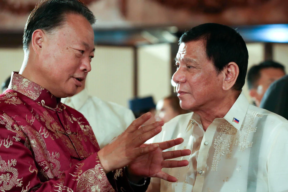 Đại sứ Trung Quốc tại Philippines Triệu Giám Hoa và Tổng thống Rodrigo Duterte trong một cuộc gặp năm 2017. Ảnh: PNA